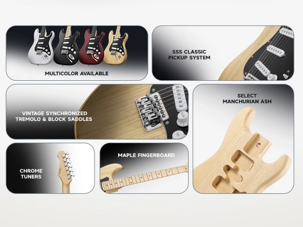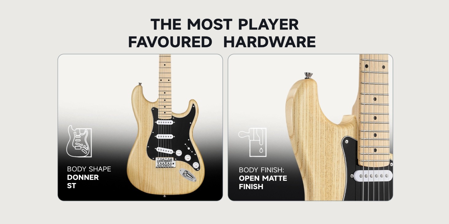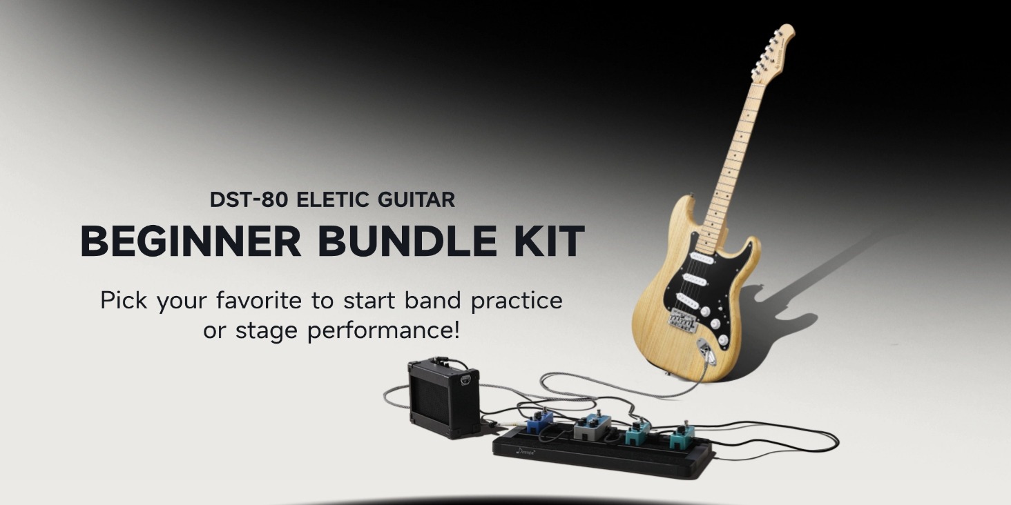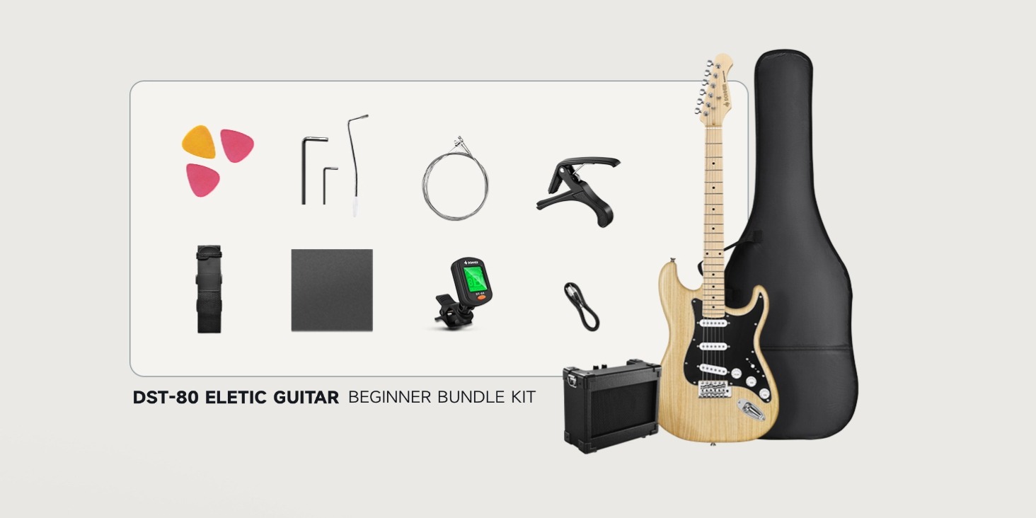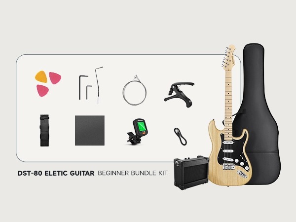 COMPLETE BEGINNERโS PACKAGE๏ผOpen the box, and youโre ready to play. This beginner kits includes the DST-80 electric guitar, custom 5W amplifier, durable gig bag, capo, strap, extra strings, digital tuner, amp cable, picks, and access to free online lessons from Donner to help you grow and shine
