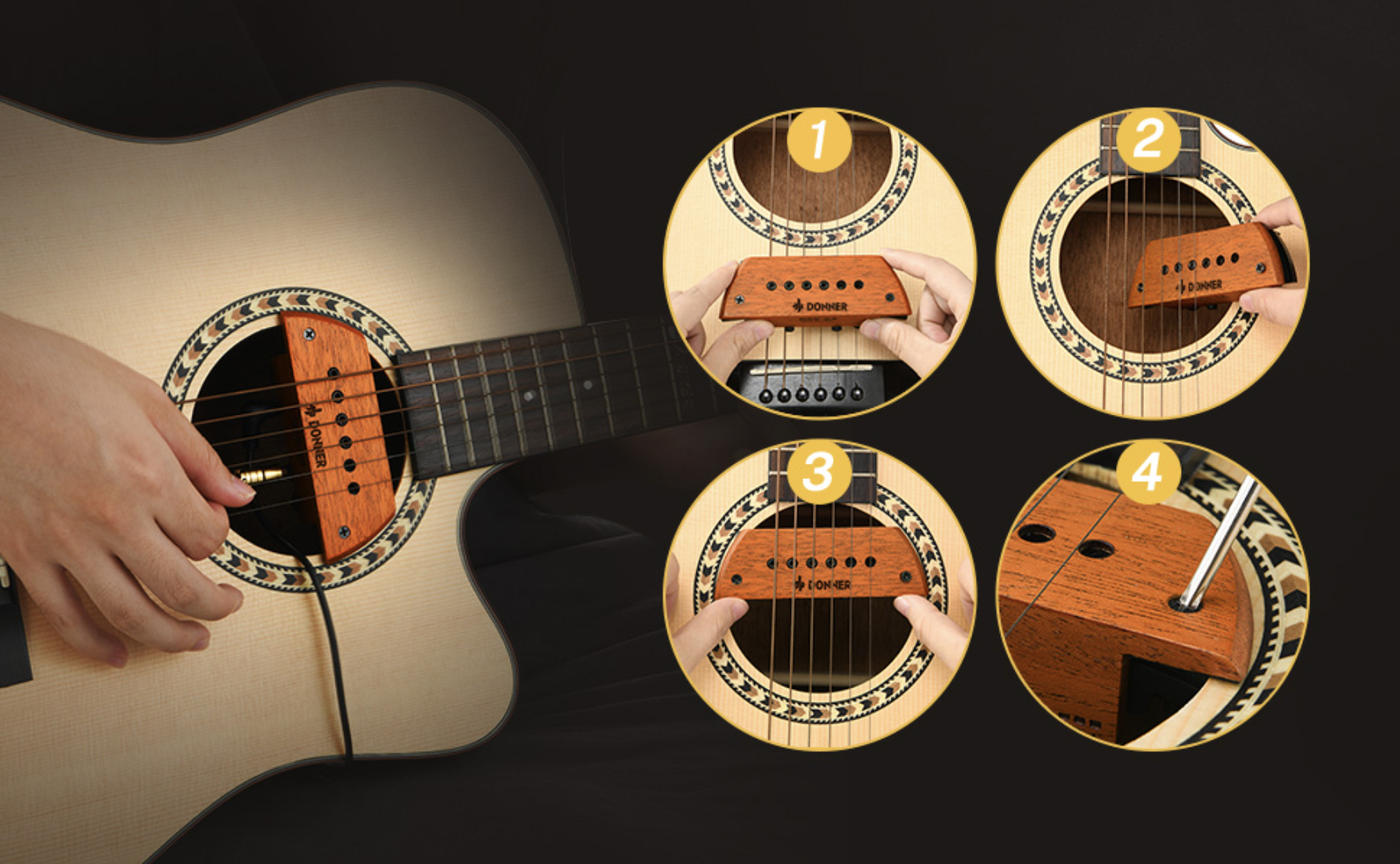 1. Take out the pickup and toward the 3.5mm jack side to the guitar bridge.