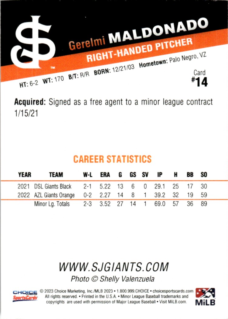 2023 Gerelmi Maldonado Choice Minor League Rookie Card RC San Jose Giants