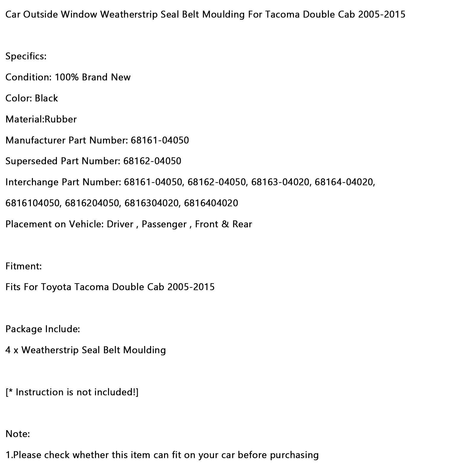 Interchange Part Number: 68161-04050, 68162-04050, 68163-04020, 68164-04020, 6816104050, 6816204050, 6816304020, 6816404020