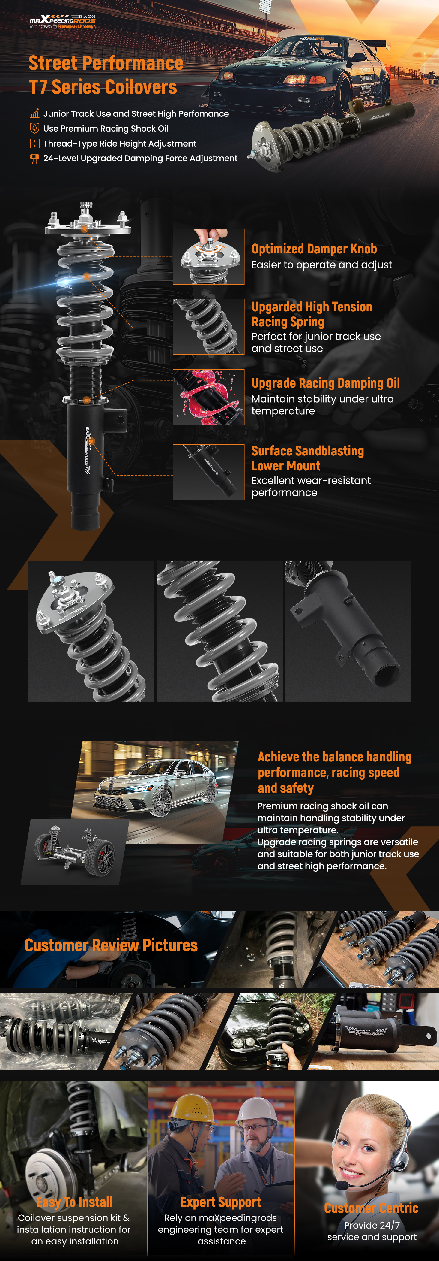 Engineered for performance enthusiasts who demand race-ready precision without sacrificing daily drivability, the MaXpeedingrods T7 Coilovers deliver track-honed handling, sharp responsiveness, and uncompromising cornering stability—perfect for carving canyons, attacking hairpins, or pushing limits on the track.