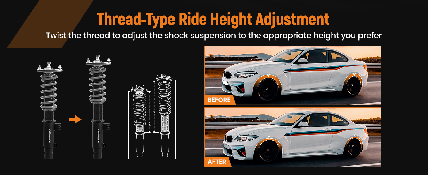 ⚫ Adjustable Spring Preload: Reduce body roll and chassis shake, delivering sharper turn-in, less understeer, and maximum tire contact—letting you carry more speed through corners with confidence.