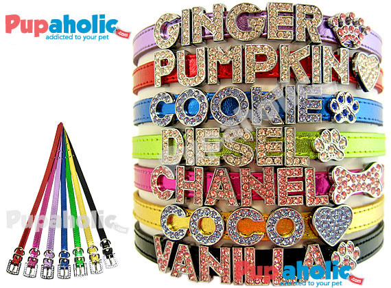 Personalized Metallic PU Leather Collar with Rhinestone Buckle! Our collars feature high quality fine PU leather pet collars. These fashionable accessories can be personalized with your pet's initials, nickname or any message by sliding on one or more of our rhinestone letters and/ or charms. We offer the best quality and lowest prices on eBay! |