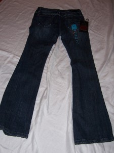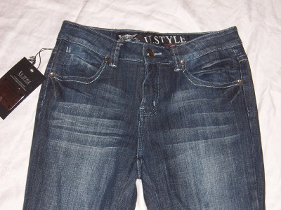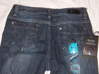 5 pocket jeans with "U.Style" buttons on front and back pockets, and zipper button. Stitching design on back pockets.