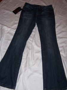 Junior's jeans, dark blue denim, boot leg, distressed look.