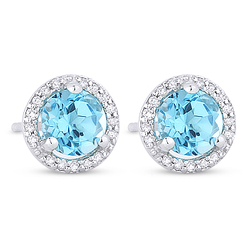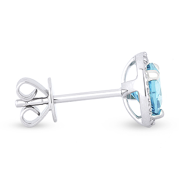 The featured earrings are cast in 14k white gold and showcase round cut blue topaz gemstones set in martini-style halo settings adorned with round cut diamond accents. The earrings are then finished with push-backs for secure wear.
