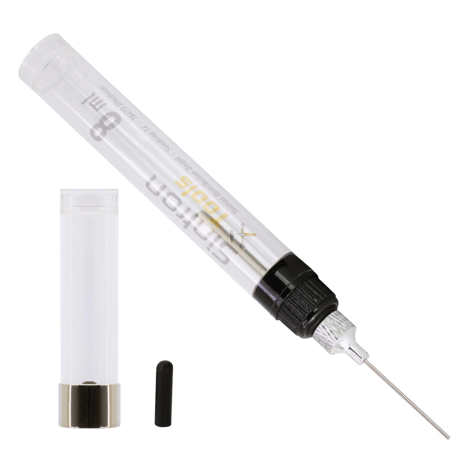 So wird die Dynavox Reinigungsflüssigkeit geliefert. Das Mikrofasertuch befindet sich bei der Auslieferung im Deckel.