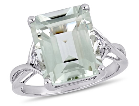Commemorate your true love with the delicate beauty of this Amour Collection Green Amethyst and White Topaz Cocktail Ring. Mounted in radiant sterling silver, it features an emerald-cut, prong-set green amethyst gemstone (12 x 10mm) in the center, enhanced by a round-cut, prong-set white topaz gemstone on each side. Polished to a brilliant shine, this gemstone ring makes the perfect addition to any jewelry collection. This gemstone cocktail ring is the perfect gift for yourself or your loved one for a special occasion.