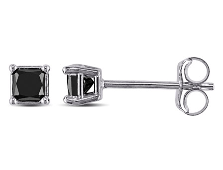 Add a little intrigue and elegance to your ears with these stunning 1/3 Carat T.W. Black Diamond Earrings. These striking black diamond earrings feature a single black solitaire princess-cut diamond, crafted in 10-carat white gold. The diamond solitaire earrings are secured with four prong posts and butterfly backs. These subtly sophisticated white gold solitaire earrings can be worn with almost any necklaces, rings or bracelets.
