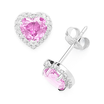 The featured October birthstone earrings showcase heart-shaped halo settings crafted in rhodium-plated .925 sterling silver adorned with pink heart-shape cubic zirconia crystals surrounded by clear cz accents. The earrings are then finished with push-back clasps so they can be worn securely on your ears.