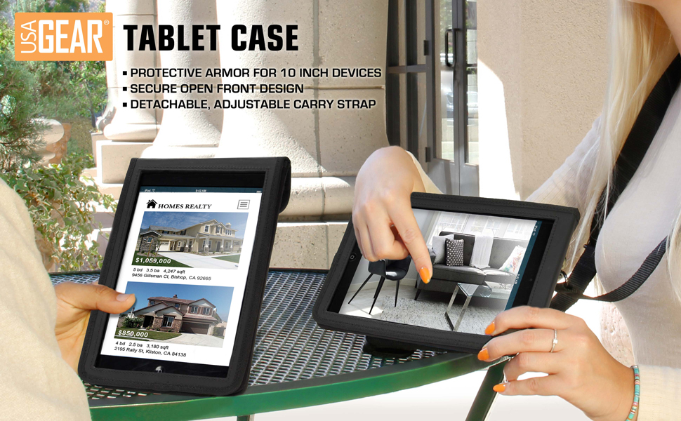 Directly access your tablet’s touch screen though the open front. Don’t worry about your tablet slipping out; the case has a rigid frame that wraps the tablet in protective armor. The USA GEAR T10 Tablet Case is perfect for: