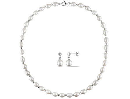 The perfect gift to express your love, with this Amour Collection Freshwater Cultured White Rice Pearl Strand Necklace and Dangle Earrings Jewelry Set. Crafted with sterling silver, this set features (8-8.5mm) freshwater cultured white rice pearls. This 18-inch necklace is secured with a lobster clasp. The stud earrings are secured with butterfly closures.