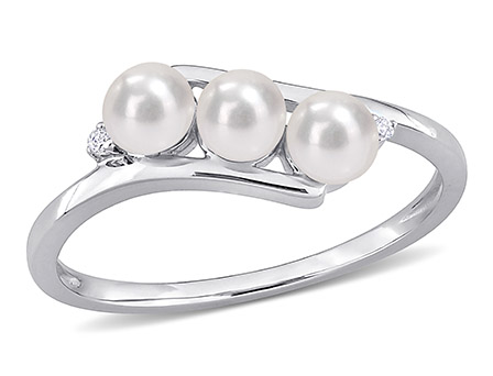 Crafted in lustrous white gold, this Amour Collection White Pearl and Diamond Bypass Ring is an exquisite symbol of your enduring love. This ring features a (3.5-4mm) white button freshwater pearls and 2 round-cut, prong-set diamonds (G-H, I2-I3) shimmering along the band.