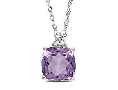 Be the glamorous one when your wear this divine Amour Collection Amethyst and Diamond-Accent Drop Pendant that will lend an eye-catching touch of sparkle to your look. Crafted in glowing white gold, it features a cushion-cut, prong-set amethyst gemstone (8 x 8mm) accentuated by three round-cut, prong-set sparkling diamonds (G-H, I2-I3) on top of the gem. This pendant is suspended on a 17-inch rope chain and is secured with a spring ring clasp. This lovely amethyst and diamond pendant will make the perfect addition to any jewelry collection.