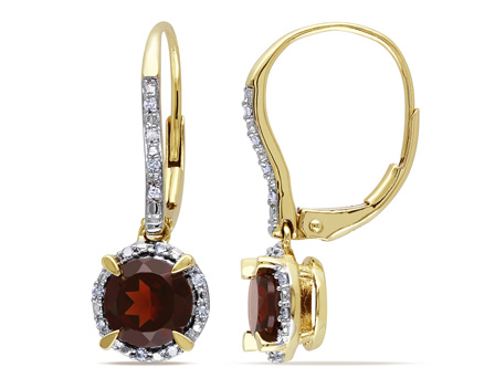 Celebrate the new year with these stylish Amour Collection Garnet and Diamond Halo Leverback Earrings. Crafted in shimmering yellow gold, these appealing earrings feature two round-cut, prong set, garnet gemstones and 24 round-cut, prong set, diamonds (G-H-I, I2-I3). Polished to a brilliant shine, these glamorous earrings are secured with leverback closures. An accessory that will light up your jewelry collection.