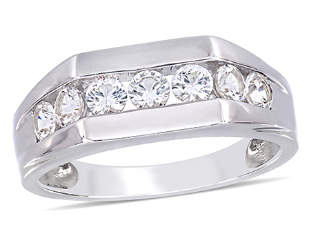 Celebrate your commitment of sharing a lifetime with him with this exquisite Amour Collection Unisex Ring. Crafted in shimmering sterling silver, this dainty ring showcases seven round-cut, channel-set created white sapphire gemstones (3.25x3.25mm). Polished to a brilliant shine, this captivating ring will be the best gift he has ever received.