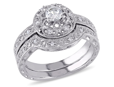 Show your devotion with this vintage-style Sterling Silver Round-cut Created White Sapphire and Diamond Bridal Set. A sparkling round-cut, prong-set created white sapphire (4mm) rests at the center of the engagement ring, accented with eight round-cut, pave-set diamonds (G-H, I1-I2) along the band. The companion wedding band is also pave set with ten round-cut diamonds and is contoured for a snug fit against the engagement ring.