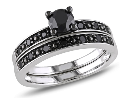 Make a lasting commitment with this glamorous Black Diamond Bridal Set. This matching wedding band and engagement ring are crafted in lustrous sterling silver with black rhodium-plating, enhanced with a high-polish finish. The engagement ring features a shimmering round-cut, prong-set black diamond at the center with 13 round-cut, pave-set sparkling black diamonds set along sides and matching wedding band. This queenly black diamond bridal set is an ideal choice for today's contemporary woman. This beautifully designed diamond bridal set is perfect for the big day.