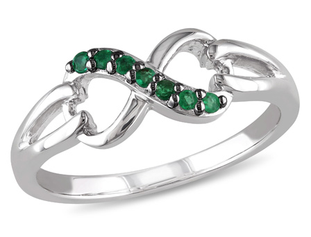 Radiate your feminine glow with this Amour Collection Emerald Infinity Ring. Crafted in lustrous sterling silver it features seven round-cut, prong-set emerald gemstones (1.5 x 1.5mm) studded in an infinity style at the center of the band giving a stylish look. Polished to a brilliant shine, a statement of elegance and sophistication, choose this shimmering infinity ring as a perfect versatile addition to any jewelry collection.