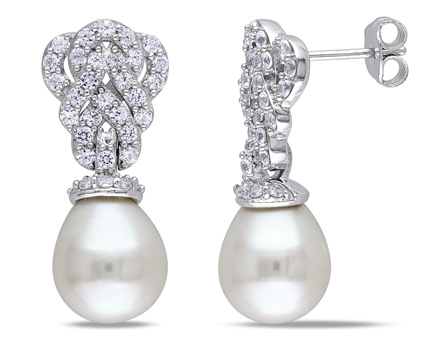 The perfect choice for a night out, these beautiful Amour Collection Freshwater White Pearl Dangle Earrings will make a dazzling statement. Crafted in sterling silver, these lovely earrings feature (9-9.5mm) freshwater cultured white pearls and round-cut (1.5mm) cubic zirconia gemstones. These pretty earrings are secured with butterfly closures.