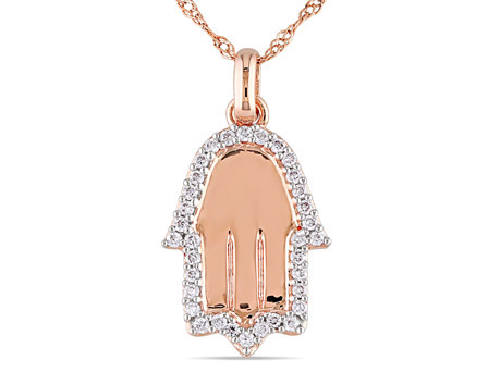 Let this exceptional classic Amour Collection Diamond Hamsa Pendant symbolize your eternal love and bring a good luck to your bellowed one. Crafted in lustrous rose gold, this pretty pendant features 34 round-cut, prong-set white diamonds (G-H, SI). The pendant is hung on an 17-inch Singapore chain and is secured with a spring ring clasp.