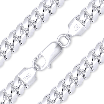The featured Italian-made 8mm chain bracelet is made up of Miami-Cuban curb links cast in solid .925 sterling silver with rhodium plating. The bracelet is then finished with a lobster-claw clasp for secure wear.