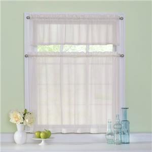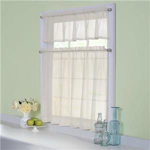 Add classic style to any window in your home with sheer voile kitchen tiers by Curtain Fresh. Now any room can look great and smell fresh too with the Curtain Fresh patented odor-neutralizing technology. Arm & Hammer, Curtain Fresh odor neutralizing sheers continuously neutralize unpleasant odors created by cooking, pets, smoke, must and mold. The ultimate blend of fashion and function - each Curtain Fresh odor neutralizing 3-piece tier set continuously helps to keep your home smelling fresh, even when you're not there. Hang Curtain Fresh curtains in the room where your pet sleeps to help remove pet odors all day long. Enjoy a fresher kitchen, baby's room, bathroom, playroom and bedroom with Curtain Fresh odor-neutralizing tiers. The photo catalytic process converts unpleasant odors into water vapor and carbon dioxide, thus causing airborne pollutants and odorous substances to degrade and neutralize. Independent testing has shown that Curtain Fresh curtains continuously neutralize odors for up to five years, with up to one washing per year. This innovative home cleaning solution was developed with the makers of Arm & Hammer, the trusted name in cleaning, freshening and deodorizing products for the home. Kitchen tiers are unscented. Each sheet kitchen tier set includes one 56" wide x 14" long rod pocket valance and two 27" wide by 32" long rod pocket tiers. Available in ivory. Set requires two curtain rods for hanging.