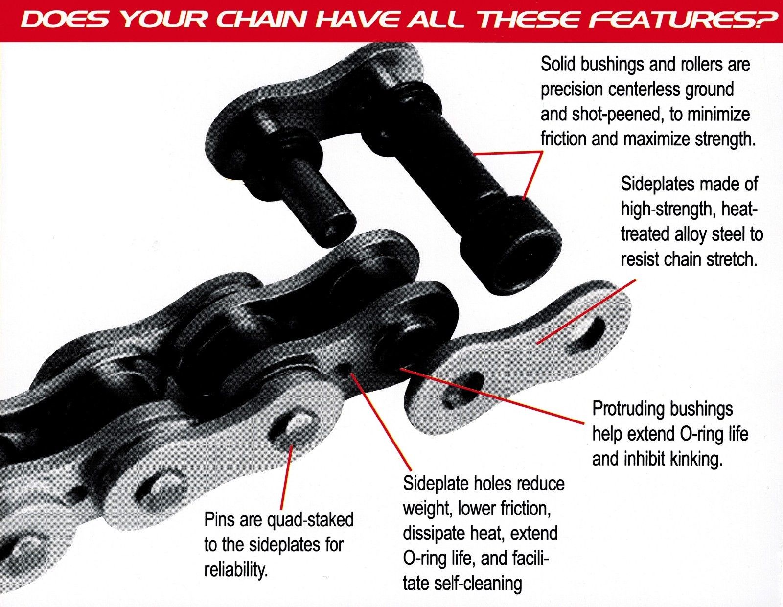 This O-Ring chain achieves permanent lubrication sealing between pin and bush. It has solid bushing, high quality of pin material and 4-side riveting, which ensure with longer lifetime and minimum maintenance. It is pre-stretched, anti-fatigue and has high-tech heat treated alloy steel, which enable a strong resistance to impact and good ware resistance.