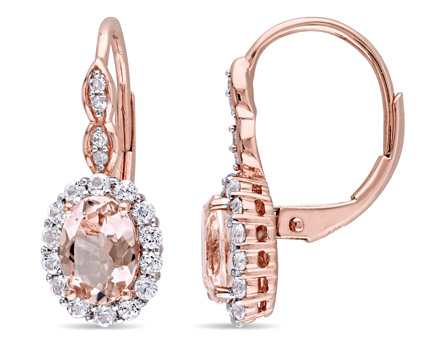 Treat yourself or someone you love to a new piece of jewelry with these Amour Collection Morganite, White Topaz and Diamond-Accent Halo Earrings. Enhanced with a high polish finish, these earrings secure with leverback closures. Mounted in glowing rose gold, they feature two oval-cut, prong-set morganite gemstones (7 x 5mm) at the center with 28 round-cut, prong-set white topaz gemstones forming halos and eight round-cut, pave-set diamonds (G-H, I1-I2) adding sparkle to the look. Coordinate these alluring earrings with any ensemble for a polished look. These eye-catching gemstone and diamond earrings make the perfect addition to any jewelry collection.