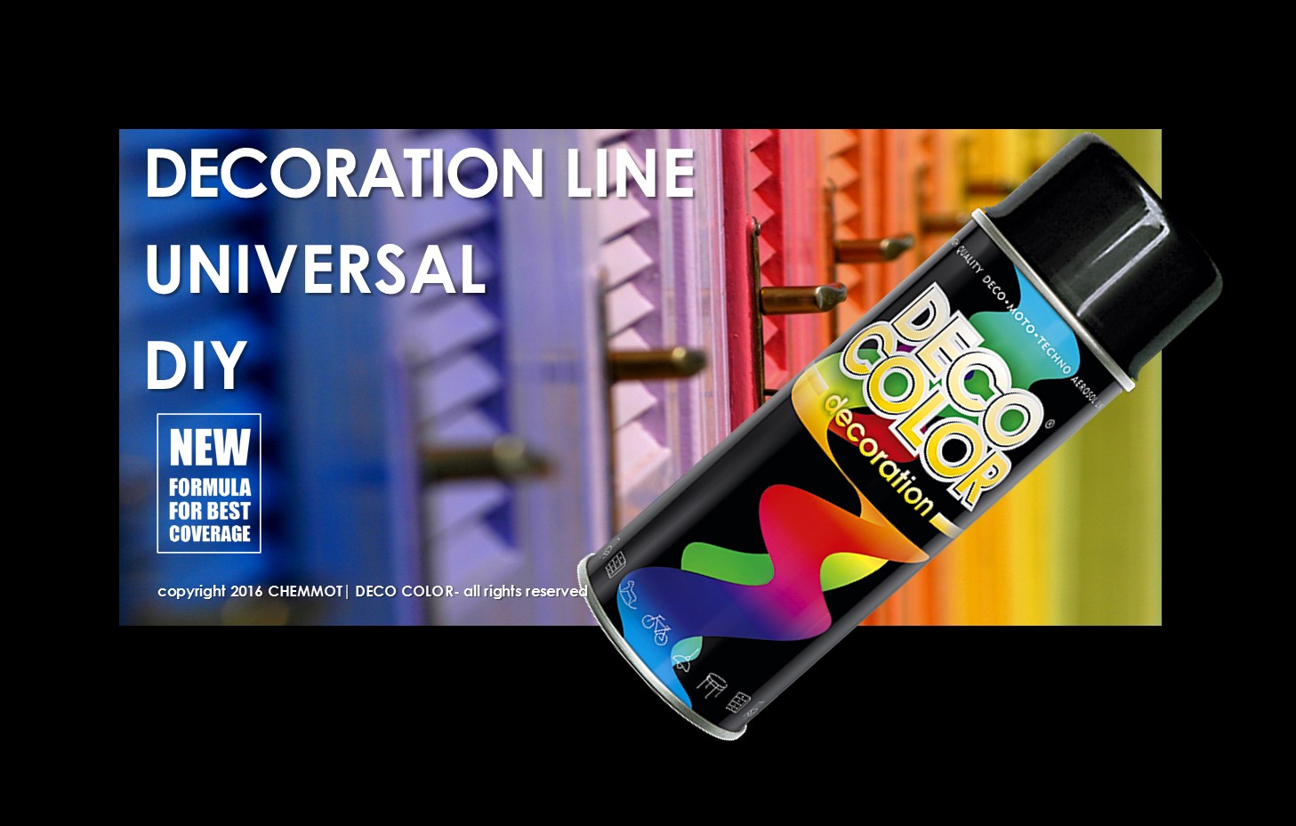![]() Universal synthetic solvent-based paint for painting surfaces made of metal, wood, ceramics, glass, wicker, cardboard, some fabrics, fresh and artificial flowers, and only some plastics. Wide range of application hobby and professional works: at home, garden, automotive and industry. Especially practical for works of art and decoration. Easy to use. High gloss finish! CHOOSE YOUR COLOUR FROM THE LIST Interested in satin/matt finish? Check out also our new trendy Decoration_matt line Notice: For surfaces made of PUR, PS, PA, EPDM, ABS, GfK, Hart – PCV use Plastic Primer DECO COLOR previously. Best result when applied at 10-25°C. Whole range in gloss. Gold and Aluminium in satin finish Black and White in both: gloss and matt finish Very good covering of painted surface Short drying time: 10-15 min Touch dry: 30-40 min; Hardened: 24 h Efficiency 1,5-2 m² depending on colour and type of surface by one application High resistance to abrasion and weather conditions Variety of colours: over 30 most common colours in RAL system For indoor and outdoor use Capacity 400 ml For better adhesion, to improve covering and to increase resistance of painted surface we advise you to use our Anticorrosive Primer previously. (Available in 4 colours - choose your suitable background) To achieve additional protection of painted surface use as a top coat RAL 0000 Transparent from same line. In such way you will achieve best final result! Usage: