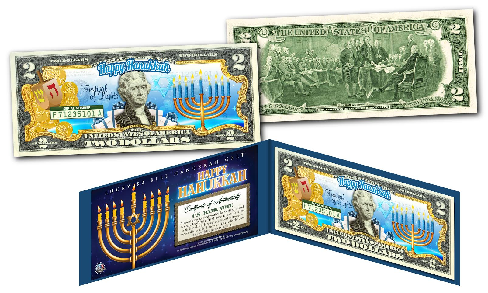 This HAPPY HANUKKAH uncirculated $2 Bill is Genuine Authentic Legal Tender of the United States, which has been enhanced with beautiful colorized images. The full colorized images are accomplished through a revolutionary new authentic & genuine colorization process pioneered by The Merrick Mint, creating a collectible work of art. Each bill comes displayed in a blue folio with a Certificate of Authenticity to guarantee that your bills are authentic and recognized by every monetary authority around the world, therefore assuring its Collector Edition status. Each $2 Bill is in FRESH, CRISP, UNCIRCULATED condition, and was directly removed from untouched wrapped Federal Reserve sealed packs. Former U.S. President Thomas Jefferson is featured on the obverse of the note, along with the special colorization overlay. The Signing of the Declaration of Independence by John Trumbull is featured on the reverse. It is the only U.S. Currency note that features two Presidents, John Adams and Thomas Jefferson, and it is one of the most rarely seen BILLS in circulation and actual use.