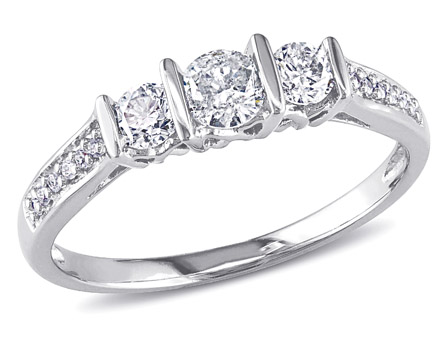 Add some shimmer to your outfit with this Amour Collection Diamond 3-Stone Engagement Ring. Crafted in lustrous white gold and features three round-cut channel-set diamonds (G-H, I2-I3) studded at the center alternating with other diamonds studded on its band. Polished to a milgrain shine, this radiant 3-stone engagement ring is sure to make her heart flutter. Pair this glamorous and stylish ring with any ensemble and look gorgeous.