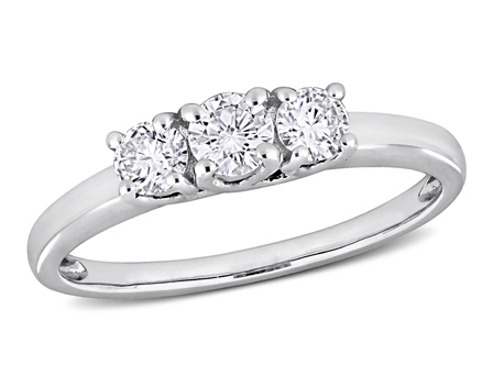 Make your wedding a perfect one with this stunning Amour Collection Diamond 3-Stone Engagement Ring. Crafted in lustrous white gold and features a round-cut, prong-set diamond at the center flanked by two round-cut, prong-set certified diamonds (G-H, I2-I3). Enhanced with a high polish finish, this 3-stone engagement ring is the precious and perfect choice for your beloved. This gorgeous ring is sure to melt her heart. Wear with any other eternity ring and complete your wedding look.