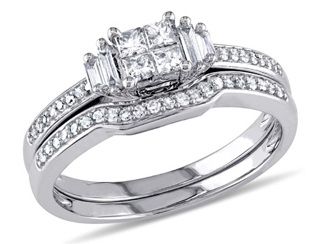 Bring a touch of opulence and timeless charm to your look with this Amour Collection Diamond Bridal Set. Crafted in lustrous white gold and features four parallel baguette-cut, prong-set diamond studded at the center with four princess-cut, prong-set diamonds (G-H, I2-I3) studded on its band. The two round-cut, bezel-set diamonds adjoining the center piece. The matching wedding band showcases 38 round-cut, pave-set diamonds studded on its band. Enhanced with a high polish finish, this alluring set is sure to make a wonderful addition to any jewelry collection. Give yourself a glamorous look with this trendsetting bridal set.