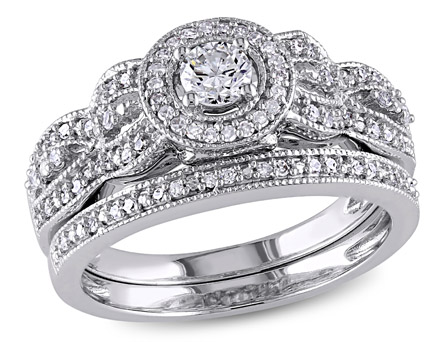 This exquisite Amour Collection Diamond Bridal Set is the perfect choice for your special one. The white gold engagement ring sparkles with a round-cut, prong-set white diamond (G-H, I2-I3) at center and 6 round-cut, prong-set white diamonds (G-H, I2-I3) with 52 round-cut, pave-set white diamonds (G-H, I2-I3) along the band. The companion wedding band is a perfect match with 20 icy round-cut, pave-set white diamonds (G-H, I2-I3) as well.