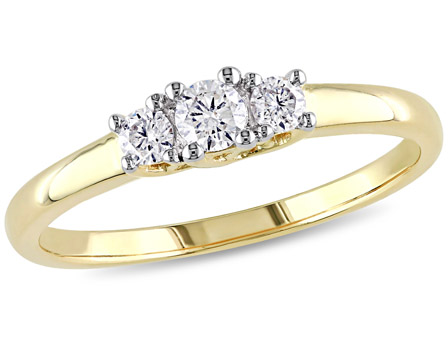 The sparkling elegance of this Amour Collection Diamond Three-Stone Engagement Ring will last a lifetime. The ring features a round-cut, prong-set white diamond (G-H, I2-I3) at the center and two dazzling round-cut, prong-set white diamonds (G-H, I2-I3) along uniquely designed yellow gold band. This ring is enhanced with a high polish finish.