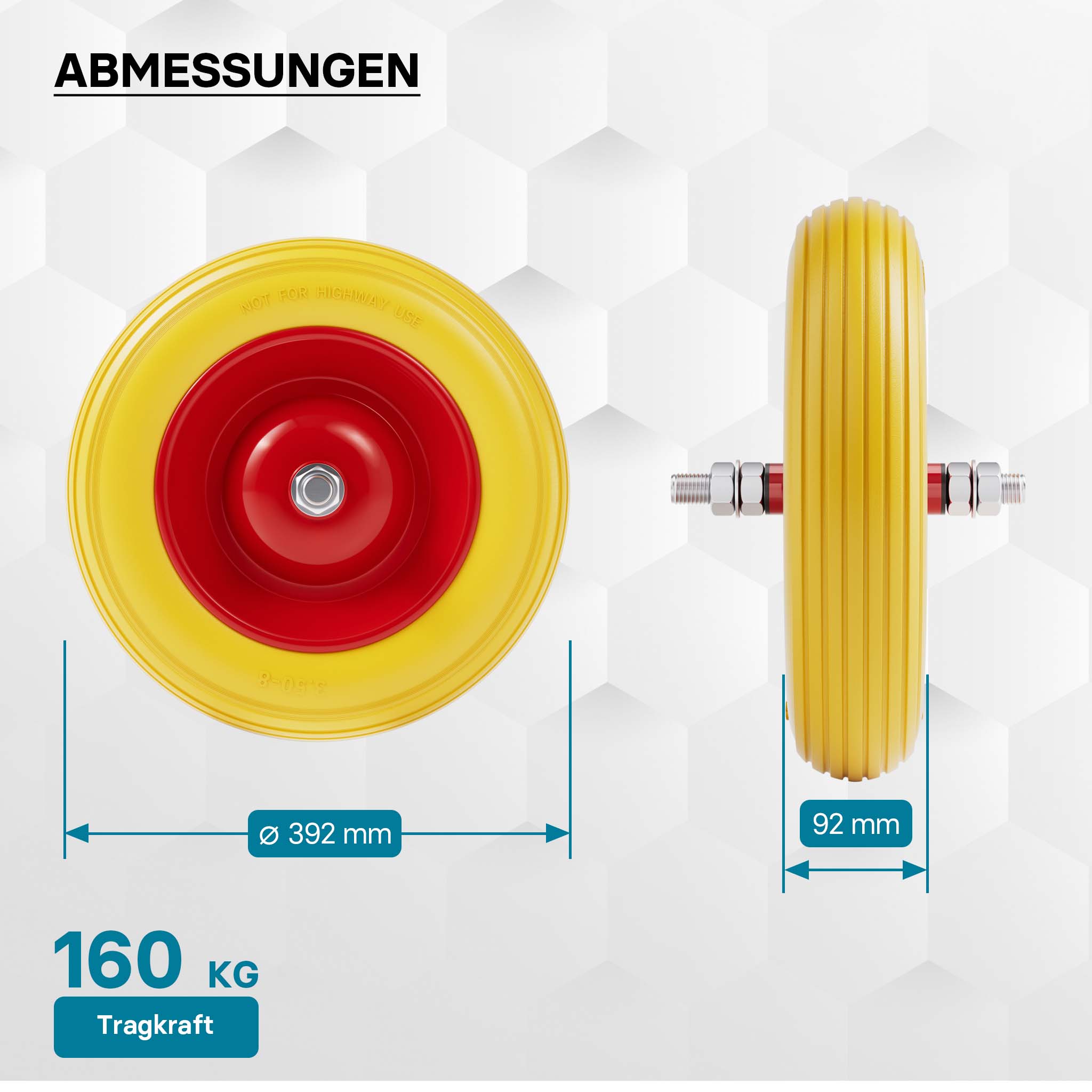 Questo pneumatico antiforatura eviterà fastidiosi imprevisti in futuro. La fornitura include una ruota da trasporto di alta qualità, a prova di foratura, con un diametro di 400 x 100 mm su un cerchio in lamiera d’acciaio verniciato a polvere con cuscinetto a rulli già montato.