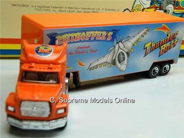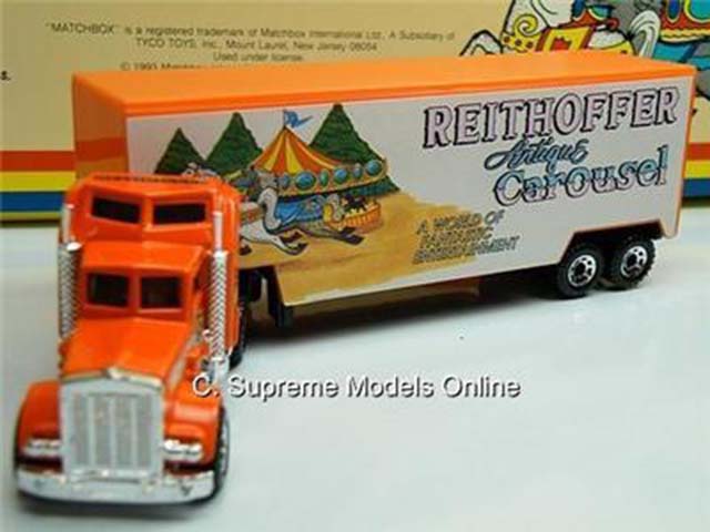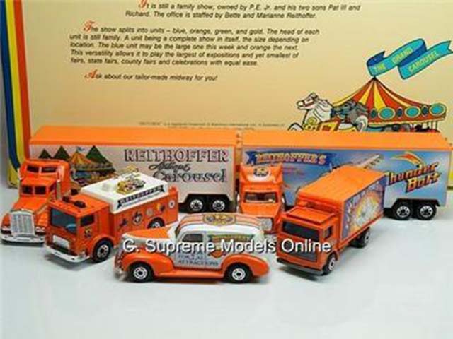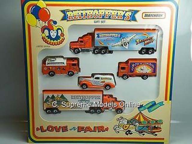 Hello, This is a die cast metal Matchbox Reithoffer Circus gift set, containing a total of 5 models which are 2 Artic trucks (Ford Aeromax and Peterbilt), Volvo lorry, Mack fire engine and '39 Chevy Van. Now a hard set to find boxed and seems to have vanished very quickly as this was not a normal shop release and produced some time ago. A stunningly detailed set and now completely sold out. The models are in mint condition and the box also is in completely shop fresh mint condition, the models can easily be removed from the box, this item would make an excellent addition to your collection and a fantastic display piece. Size of the models are 1/64th scale, the artic trucks measure 18cm long each, the Mack fire engine 7cm, Volvo and Chevy each measure 8cm long. More detailed pictures below.