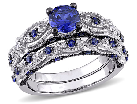 The remarkable symbol of the beautiful symphony of the life and love you'll share together, this Amour Collection Milgrain Design Vintage Style Bridal Set is crafted in lustrous white gold. The engagement ring features a round-cut (six-millimeter) created blue sapphire center gemstone and 11 round-cut (1.5-millimeter) created blue sapphire gemstones with 16 round-cut, prong-set icy diamonds (G-H, I2-I3) shimmering along the sleek shank. The companion wedding band features 13 round-cut (1.5-millimeter) created blue sapphires for a perfect match. Impeccable design and unmatched craftsmanship, this high polished, milgrain finished set will be her companion for life.