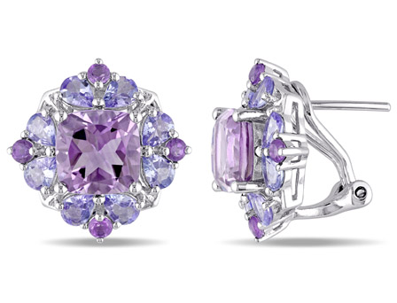 Wear the look of luxury and look elegant with these breathtaking Amour Collection Amethyst and Tanzanite Cluster Earrings. Crafted in lustrous sterling silver, they feature two cushion-cut and eight round-cut, prong-set amethyst gemstones (8 x 8mm) clustered together with 16 pear-cut, prong-set tanzanite gemstones (4 x 3mm). Enhanced with a high polish finish, these gemstone earrings make the perfect addition to any jewelry collection. These shimmering gemstone earrings comfortably secure with post and omega back closures.