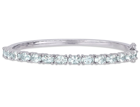 Feel like a princess when you wear this Amour Collection Aquamarine Bangle. Crafted in lustrous sterling silver, it features 15 oval-cut, prong-set aquamarine gemstones (6 x 4mm) studded in a row half way around the bangle. Enhanced with a high polish finish, this bracelet measures 7-inches in length and opens with a hinge. Coordinate this gemstone bangle with any ensemble for a stunning look.