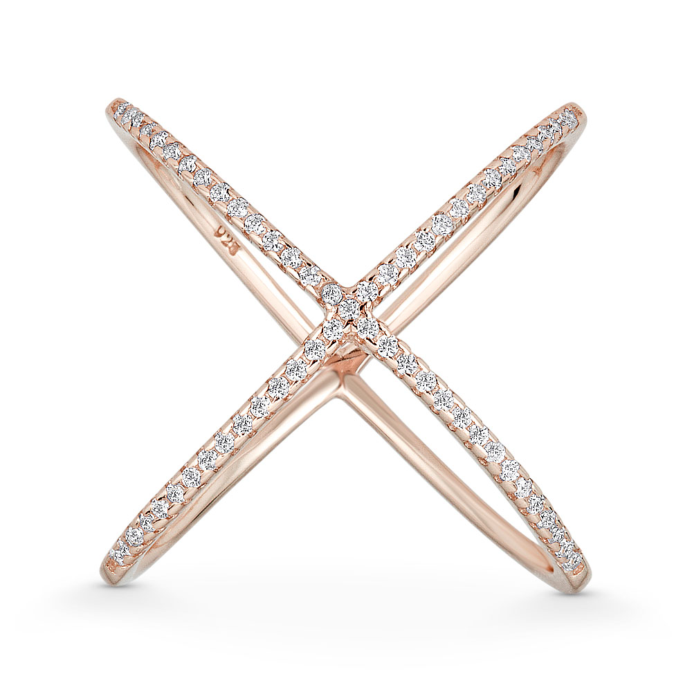 The featured ring is cast in .925 sterling silver and showcases a criss-crossing "X" design plated with 14k rose gold and adorned with cubic zirconia crystals.
