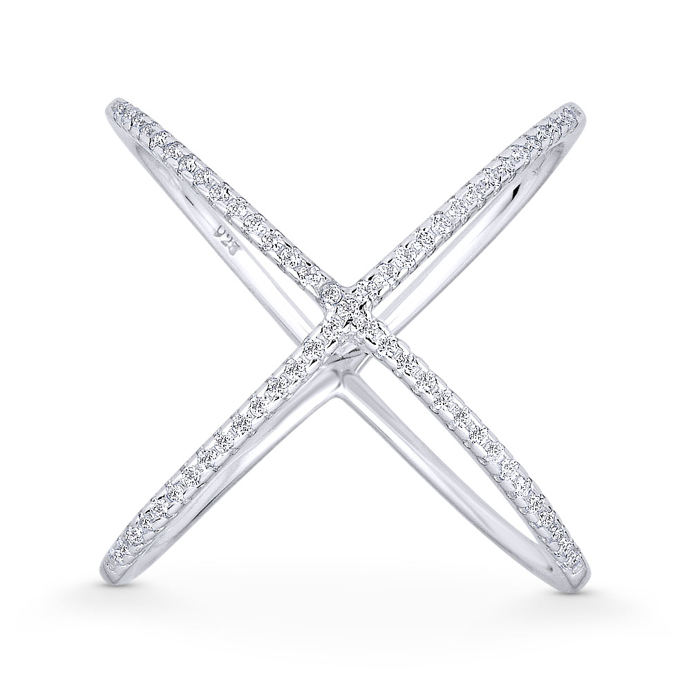 The featured ring is cast in .925 sterling silver and showcases a criss-crossing "X" design plated with rhodium and adorned with cubic zirconia crystals.