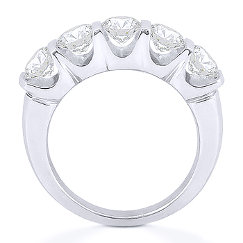The featured five-stone wedding ring is cast in 14k white gold and showcases round brilliant moissanite gems from Charles & Colvard's Forever ONE Moissanite Collection all set on open u-settings with shared bar-prongs.