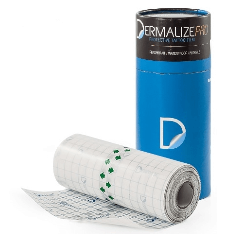 Dermalize Protective Tattoo Film is the all-in-one tattoo aftercare solution for the initial healing stage of a tattoo: a second skin that acts as a barrier to protect the tattoo wound from germs & bacteria & at the same time, is permeable allowing the skin to breathe. By locking in the body’s natural fluids and enzymes it assists the skin to heal naturally from the inside out, guaranteeing beautifully healed tattoos