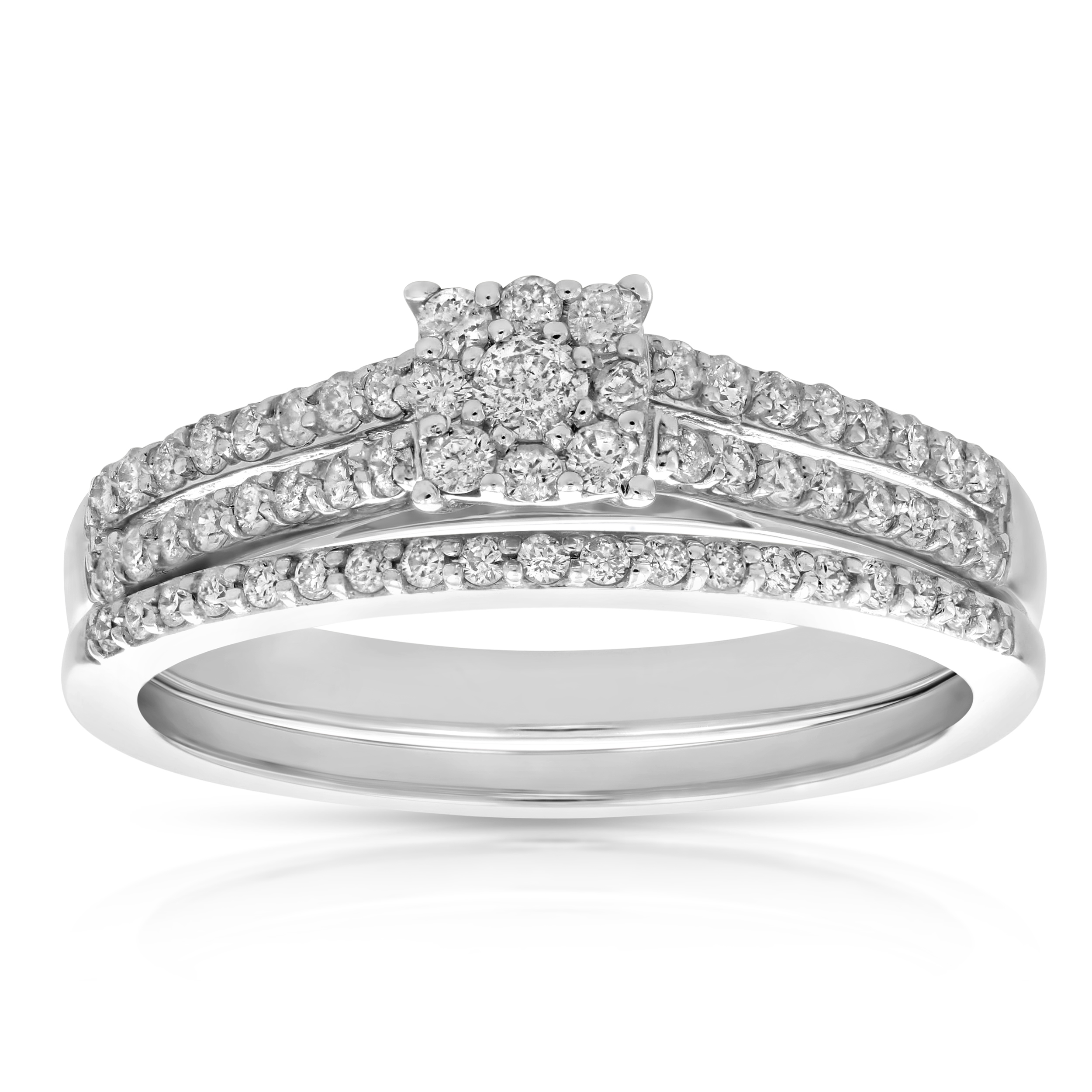 Product Description Stunning, elegant 1/2 cttw diamond bridal set in 14k white gold with 60 dazzling diamonds set in a prong setting. The center diamond weighs 0.05 cttw while the side diamonds weigh 0.45 cttw. The diamond bridal set weighs 3.1 grams. Gift box is included with purchase of this engagement ring and matching wedding band.