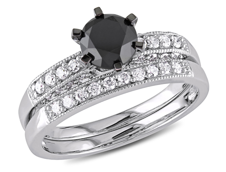 Show your love with this amazing Asteria Black and White Diamond Bridal Set. Crafted in sparkling white gold with black rhodium plating, this attractive engagement ring features a round-cut, prong-set black diamond at the center with 32 round-cut, pave-set twinkling white diamonds (G-H, I2-I3) sparkling along the shank and adorning the matching wedding band. Enhanced with a milgrain finish, this black and white diamond bridal set is sure to put you in the spotlight and is the perfect piece of jewelry to surprise your loved one with.