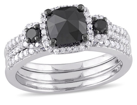 Impress your loved one with this gorgeous Three Stone Halo Bridal Set crafted in sparkling sterling silver. The engagement ring features a cushion-cut, prong-set black diamond at the center, flunked by the two round-cut, prong-set black diamonds, while 52 round-cut, prong-set diamonds (G-H, I2-I3) shimmers along the splendid shank of the ring. The perfectly matching companion wedding band features 44 round-cut, prong-set diamonds (G-H, I2-I3). Impeccable design and unmatched craftsmanship, this high polished set will be her companion for life.