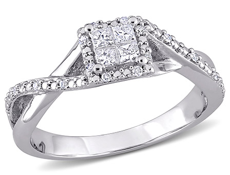 An unforgettable way to show your love and devotion, this Amour Collection Infinity Halo Engagement Ring will make her speechless. Crafted in lustrous sterling silver, this classy and elegant ring sparkles with 4 princess-cut, invisible-set diamonds (G-H, I2-I3) at the center with 14 round-cut, prong-set diamond (G-H, I2-I3) shimmering along the halo designed crown and sides of the splendid band. This dazzling ring is enhanced with a high polish finish.