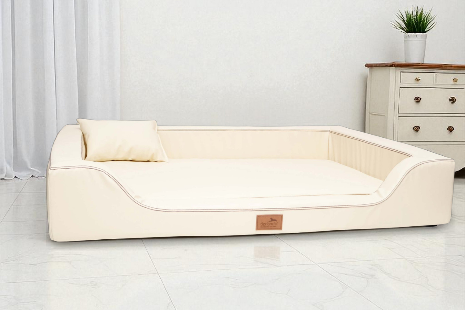 Seit über 20 Jahren fertigen wir hochwertige Hundebetten und verfügen über umfassende Erfahrung mit den Eigenschaften von Kunstleder. Dabei ist besonders zu beachten: Kunstleder darf keiner dauerhaften Feuchtigkeit ausgesetzt werden! Um Ihr Hundebett langfristig zu schützen, empfehlen wir dringend, stets eine Decke zu verwenden. Diese schützt das Kunstleder vor Feuchtigkeit, Schmutz und Krallen. Andernfalls kann das Material bereits nach kurzer Zeit spröde werden und Risse entwickeln. Bitte beachten Sie, dass bereits ein feuchter oder nasser Hund, der sich ins Bett legt, das Kunstleder schädigen kann. Auch eine häufige und intensive Reinigung mit Wasser führt dazu, dass das Material über längere Zeit Feuchtigkeit ausgesetzt wird und dadurch an Stabilität verliert. Schäden, die durch unsachgemäße Nutzung oder Pflege – insbesondere durch Feuchtigkeitseinwirkung – entstehen, sind von der gesetzlichen Gewährleistung ausgeschlossen. Nicht trocknergeeignet, nicht bügeln, nicht chloren, nicht bleichen. Als Feuchtigkeitsschutz für die Matratze bieten wir unsere Matratzenschoner MEDIC an, die wie ein Spannbettlaken über die herausnehmbare Matratze gezogen werden.